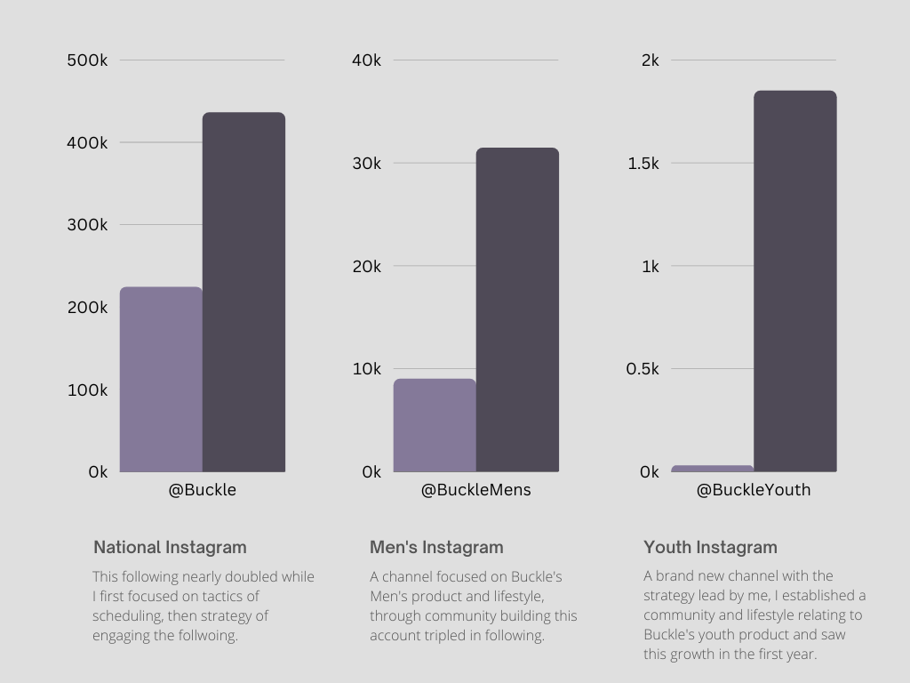 During my time at Buckle I implemented social media strategies, both paid and organic, that inspired and engaged a community of over 1 million followers. Buckle is a national fashion retailer of women’s, men’s, and kid’s styles with 450 stores across the nation and with a strong e-commerce presence. Here are a few highlights from my time there: